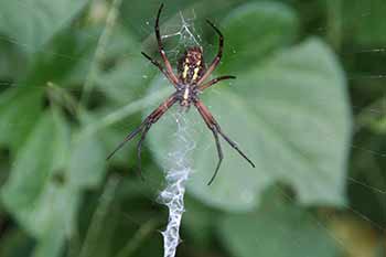 The second spider is making a hiding spot from leaves rolled down and stuck together with silk. This one lived in my garden and ate insects that attacked the vegetables. Many spiders do this. They don't make webs but rather hide and go hunting venturing from their silk house.